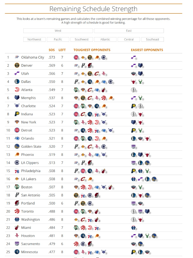 剩余赛程难度榜:雷霆掘金前二 湖人第16骑士倒2