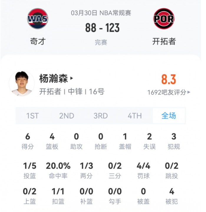 菜鸟杨瀚森6分4板1帽 克尼佩尔13分三分6中1