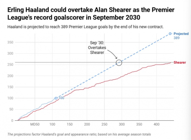 天空体育预测:若保持当前效率,哈兰德将在2030年9月超越希勒260球纪录,届时年满30岁