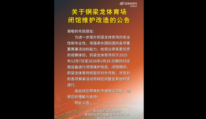 官方宣布:铜梁龙体育场将进行闭馆维护改造